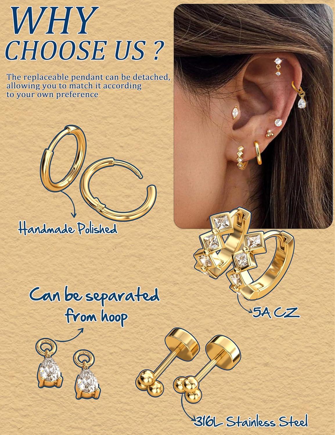 Discover the art of self-expression with Fansilver Hypoallergenic Gold Stud Hoop Earrings for Women —— premium gold earrings set designed for multiple piercing styles. Our meticulously designed gold hoop and stud earrings set , surgical steel helix earrings blends timeless elegance with modern trends, offering an exquisite collection perfect for building your earring stack, whether you love dainty earring stacks or bold statement looks. Each gold earring set includes various hypoallergenic gold flatback stud earrings , cartilage earring sets for multiple piercing, meticulously made from premium surgical stainless steel—ideal for cartilage earrings , flat back stud earrings , helix piercing jewelry , tragus piercing jewelry , conch piercing jewelry , daith piercing jewelry , huggie earrings, screw back earrings for women , first hole, second hole. The gold hoop and stud earring sets for multiple piercing shimmer with CZ charms dangle chain, adding a touch of radiant sophistication to any earring stacks. Our hypoallergenic surgical steel earrings for sensitive ears ensures comfortable wear all day, while the flatback design offers secure, easy insertion for multiple piercings. Fansilver' s gold flat back earrings , hypoallergenic gold stud earrings , small hoop earrings for women are expertly engineered for durability and shine, making them perfect earrings set for women or those seeking 20g surgical stainless steel small gold earrings . Whether you desire a bold earring stack, subtle helix earrings or versatile surgical steel stud earrings , these piercing earrings studs for women offer endless styling possibilities. Celebrate your individuality with this 20g surgical stainless stunning earring sets for multiple piercing —embrace tradition, express yourself, and let Fansilver's gold earring stacks for multiple piercings become the representation of your style.
