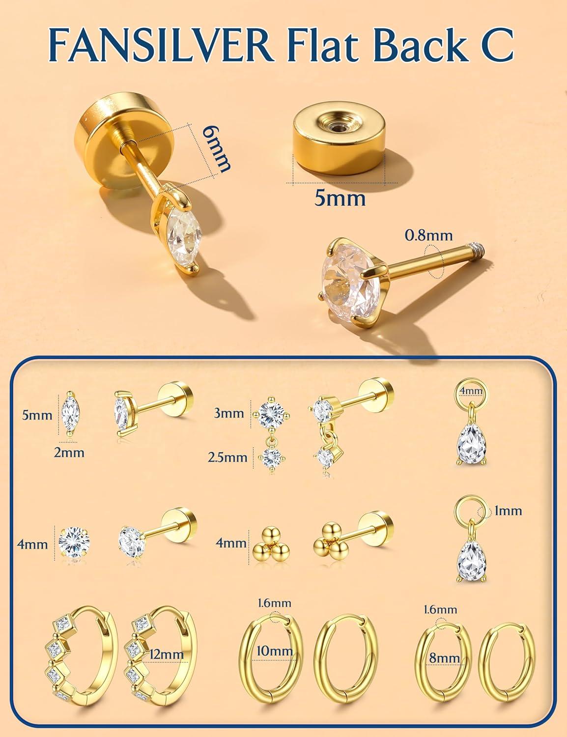 imageFansilver Hypoallergenic Gold Stud Hoop Earrings for Women Surgical Steel Flatback Stud Earrings Gold Hoops With CZ Charms Dangle Chain Earring Stacks Cartilage Earring Sets for Multiple PiercingGold Plated 3