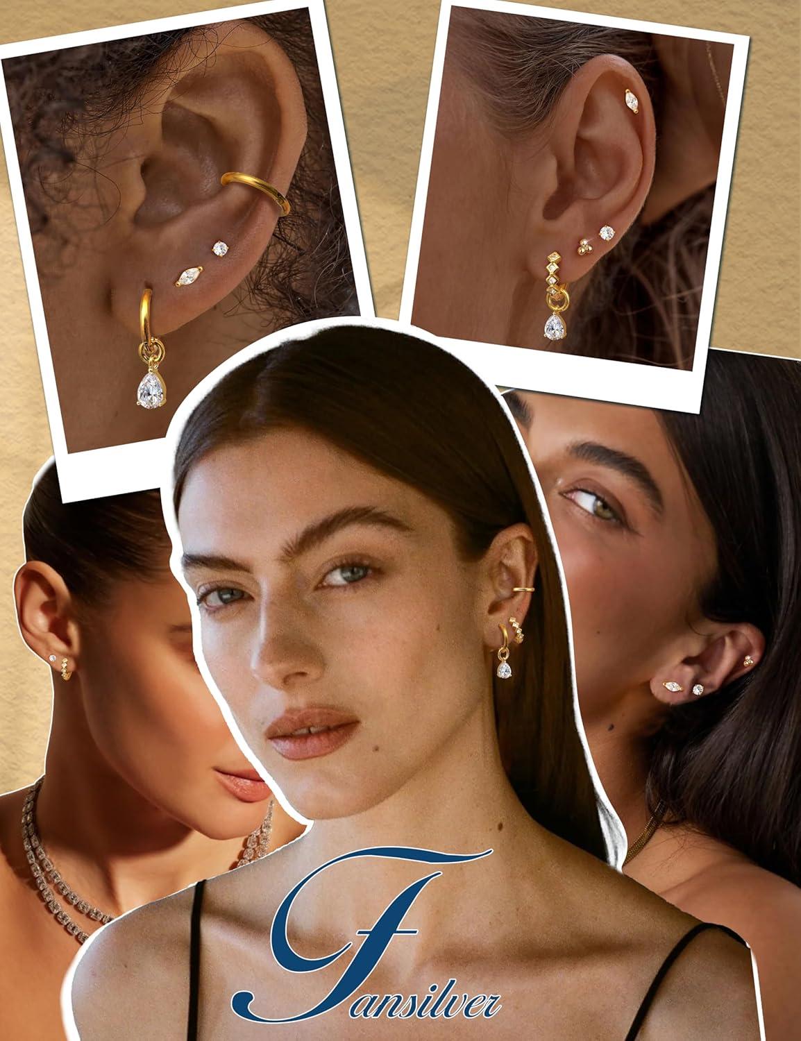 imageFansilver Hypoallergenic Gold Stud Hoop Earrings for Women Surgical Steel Flatback Stud Earrings Gold Hoops With CZ Charms Dangle Chain Earring Stacks Cartilage Earring Sets for Multiple PiercingGold Plated 5