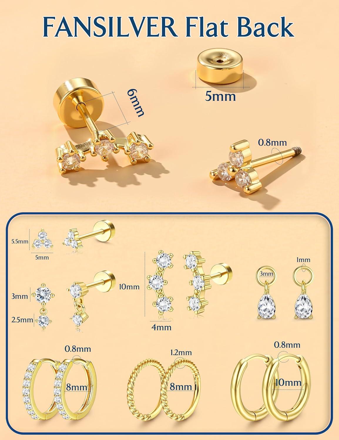 imageFansilver Hypoallergenic Gold Stud Hoop Earrings for Women Trendy  Cartilage Earring Stacks  Surgical Stainless Steel Flat back Stud Earrings Gold Hoops With CZ Charms Cute Dangle Chain Huggie Earring Sets for Multiple Piercing14K Gold Classic Style CZ