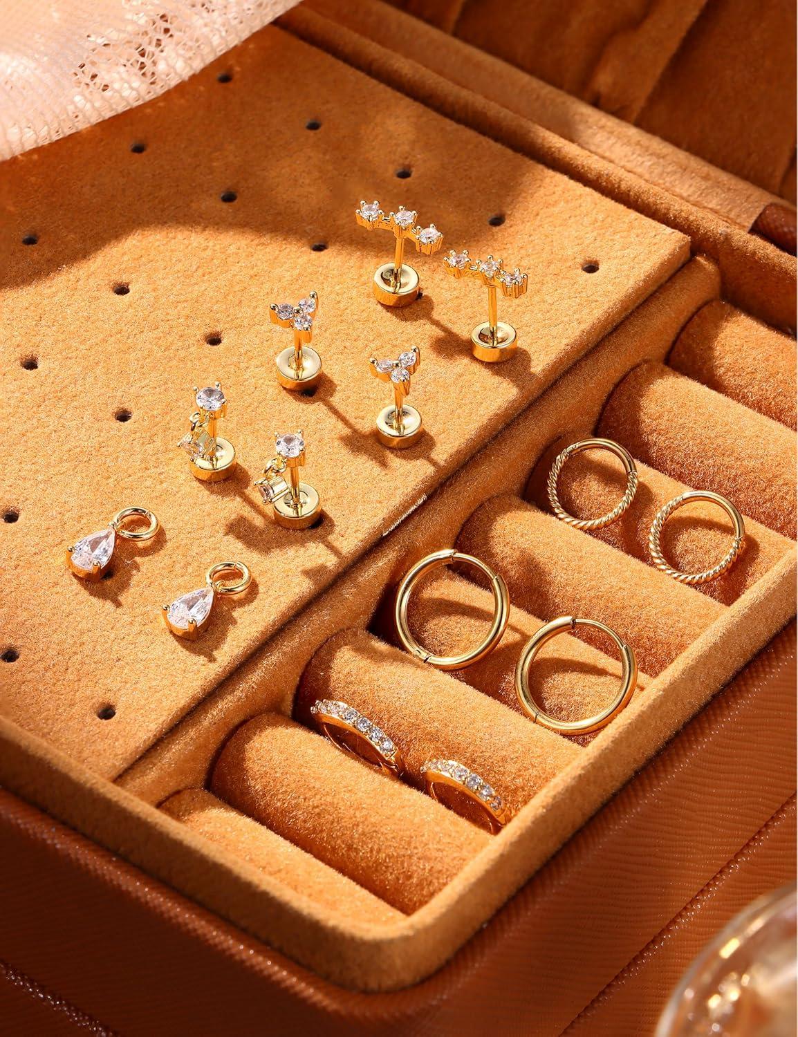 Discover the Art of Your Ear Stack Introducing Fansilver’s Hypoallergenic Gold Stud & Hoop Earrings Set—a premium collection of gold earrings for women designed for versatile wear. Whether you love dainty earrings or bold earring stacks, this complete gold earrings set includes small gold earrings, stud earrings for women hypoallergenic, and elegant chain earrings to express your style across every piercing. Hypoallergenic & Comfortable for All-Day Wear Crafted from stainless steel gold earrings with a hypoallergenic finish, these womens earrings are nickel-free and lead-free—ideal even for sensitive ears. The flat back stud earrings and small stud earrings for women offer a secure fit, making them perfect as helix piercing jewelry, tragus piercing jewelry, or cartilage earrings. Lightweight and irritation-free, they’re hypoallergenic earrings for women you can trust. Create Endless Stacking Possibilities From minimalist studs earrings for women to shimmering CZ-accented hoops, this gold earring pack lets you build a customized gold earrings stack. Mix and match your earring sets for multiple piercing—ideal for the first hole, second hole, or a curated earrings stack across your ears. These stackable earrings offer effortless style from day to night. Your Go-To Gold Earring Collection Fansilver delivers real gold earrings for women look without the luxury price. This earring sets for women includes everything you need in one gold earring sets—durable, radiant, and ready to wear. Perfect as dainty earrings for women or as part of a statement earring set, it’s the ultimate gold earrings pack for building a layered, personalized look.